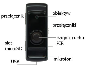 Prezentowane urządzenie to najmniejsza dostępna obecnie na rynku kamera wyposażona w czujnik ruchu typu PIR (pasywny detektor podczerwieni). Dzięki takiemu rozwiązaniu ta mini kamera może czuwać do 4 dni w przypadku zasilania z wbudowanego akumulatora. Wykrywanie ruchu działa na dystansie do 3 metrów. W przypadku podłączenia urządzenia do ładowarki, kamera może pracować beż żadnych ograniczeń czasowych. Po zapełnieniu karty pamięci najstarsze nagrania będą sukcesywnie usuwane.